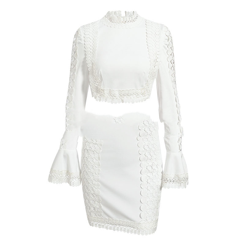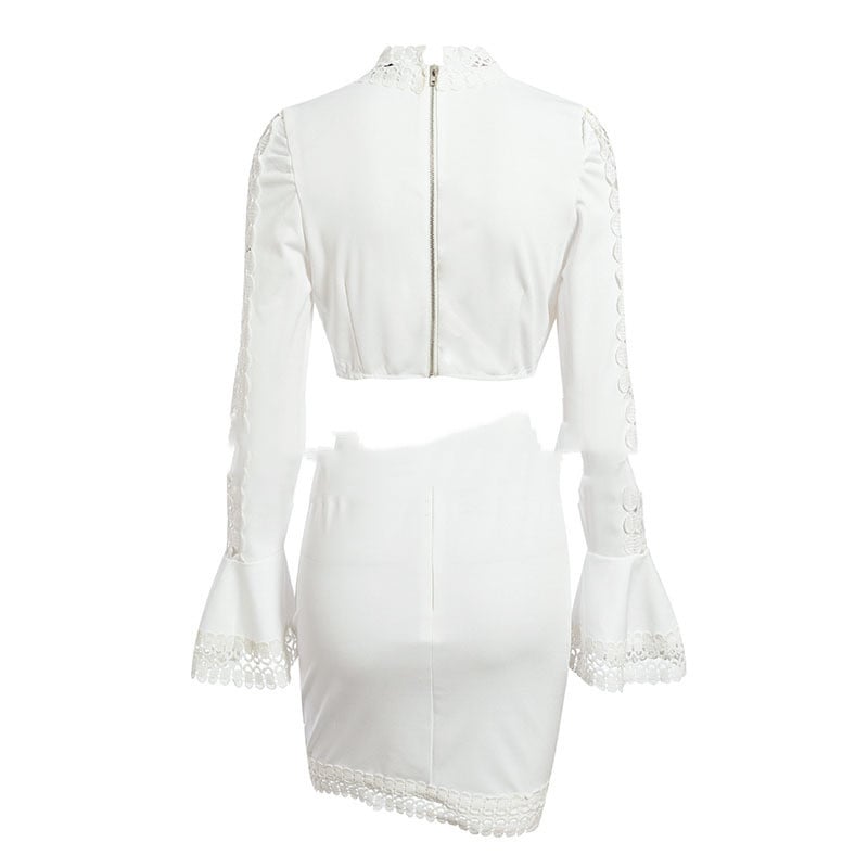 Embrace the essence of summer with our stunning two-piece women's outfit, featuring a white lace flared sleeve top and a chic short skirt. Perfect for any occasion, this skirt suit is designed to make you feel both beautiful and comfortable.